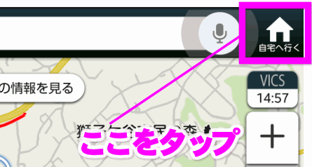すると、画面の左上に「自宅へ行く」というボタンがアクティブ(有効)になるので、ここをタップすると、現在位置から自宅への経路を表示してくれます。