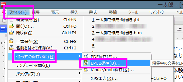 スマホなどで電子書籍を読めるようにEPUB形式で保存するには、「ファイル」の「他形式の保存/開く」の中の「EPUB保存」を選択します。
