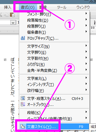 縦書き表示にするには、「書式」をクリックし、「文書スタイル」をクリック。