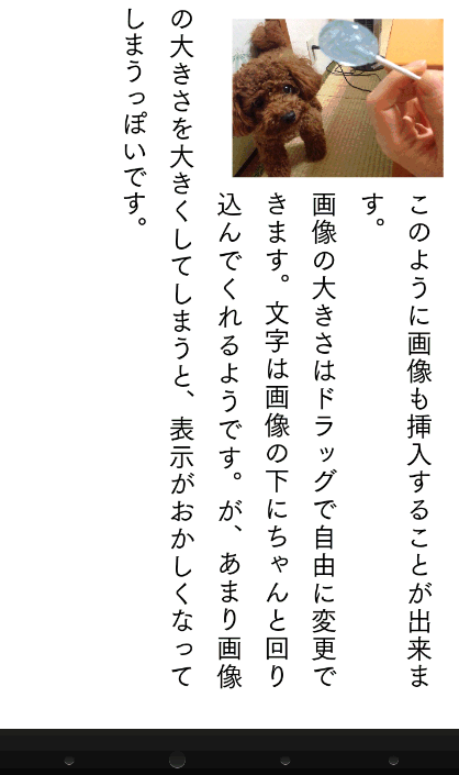 画像の端をマウスで調節すれば、画像の大きさを自由に変更できます。が、あまり大きくすると、文字の表示がおかしくなるようなので、この程度の大きさにとどめておくのがベター。