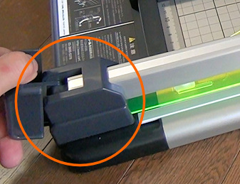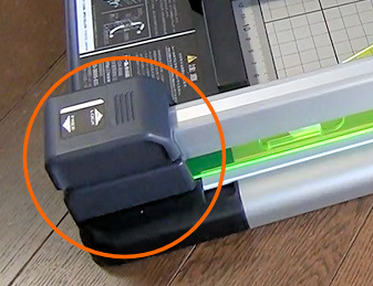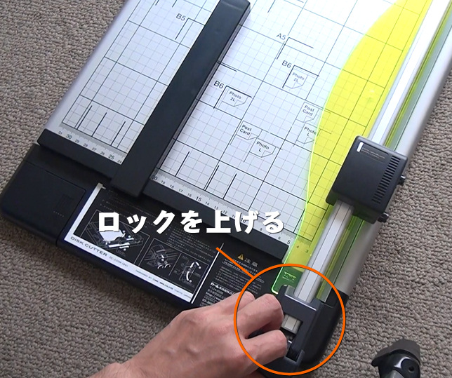 このロックを持ち上げると、黄色の蛍光色の押さえが持ち上がり、切断する本を入れることができます。