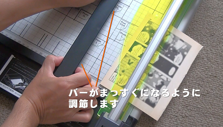 切断する幅を決めたら、位置調整用のバーを本の端に合わせます。