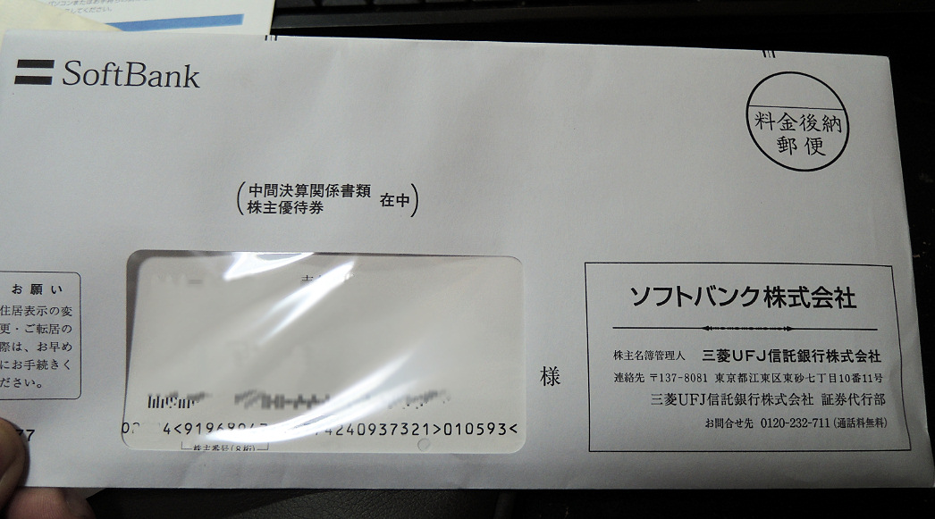 ソフトバンク以外にもトヨタの株も購入してたのですが、やはり封筒が届いていました。