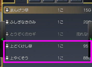 ところが、錬金釜で作った「上やくそう」を道具屋などに売ると「88G」で売れるんです。