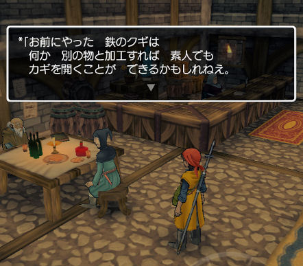 港から外にでるときに通過する大きな宿屋の1階に、男性が二人いるので、一人に声をかけると「鉄のクギ」をもらえます。