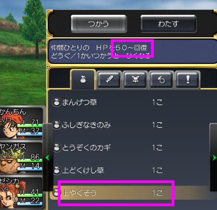 普通の薬草は30ポイントしか回復しませんが、上やくそうだと50ポイントほど回復するようです。
