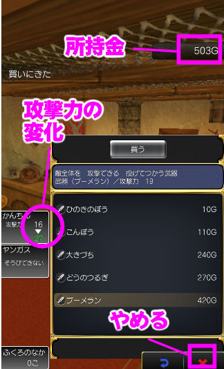 ここで覚えにくいカタカナの武器が並んでいたら、そこで辞めちゃいそうですが、おなじみの武器のままで良かったです。