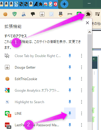 Chromeアプリのアイコンがツールバーにない場合は、ツールバーの右端にある拡張機能のアイコンをクリックし、②のLINEの右横にあるピンのようなアイコンをクリックしてください。