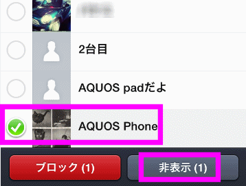 「AQUOS Phone」という友達を「非表示」にしてみました。