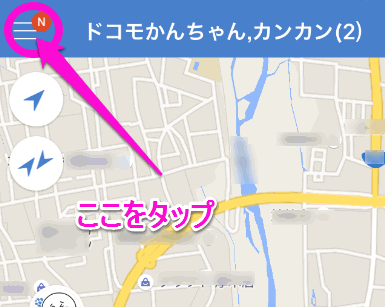 まずは、地図が表示されている画面で、画面左上のまるで囲った部分をタップします。