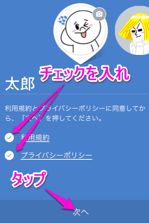 利用規約とプライバシーポリシーにチェックを入れ、「次へ」をタップします。