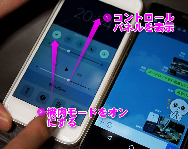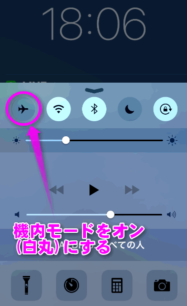 画面の下から上に、指でスライドさせると、「コントロールセンター」が表示されるので、左上の飛行機のアイコンをタップして、「機内モード」にします。