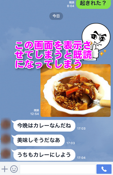 この状態なら、万が一、既読を付けたくない相手のトーク画面が開いてしまっても、受信したメッセージは表示されていないし、また、相手にも既読マークがつきません。
