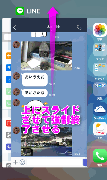 このような画面になるので、LINEの画面を上にスライドさせ、強制終了させます。