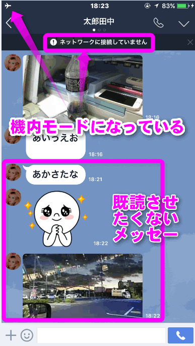 新規のメッセージを受信した状態+機内モード で、相手のトークを開くと、このようにメッセージを表示せても・・・