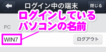 上の画面で、「ログイン中の端末」という部分をタップすると、今現在ログインしているパソコンの名前が表示されます。