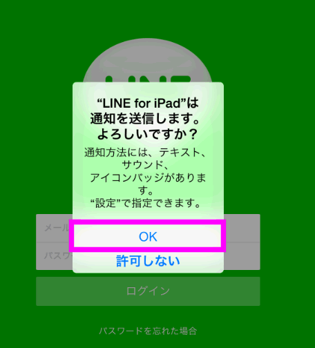 iPadにLINE for iPadをインストールし、立ち上げると通知してよいかどうか尋ねられるので、「OK」をタップします。