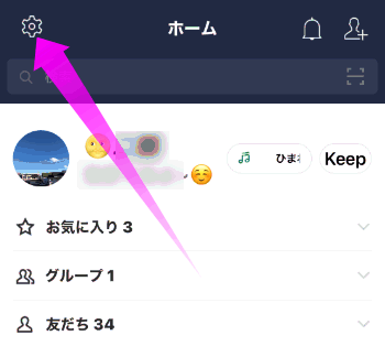 新しいスマホのLINEのホーム画面の左上(iPhone)にあるダイアルをタップします。