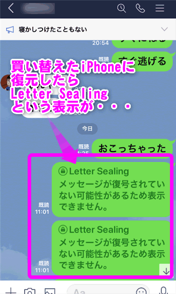 先日、新しいiPhoneを購入し、今まで使用していたiPhoneのLINEを引き継ごうと、バックアップしたトークを復元したところ、友だち登録した一部の相手に送った私のメッセージが、「Letter Sealing」と書かれて見ることが出来なくなってしまいました。