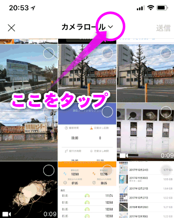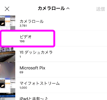あとは送りたい動画にチェック(タップする)し、右上の「送信」をタップします。