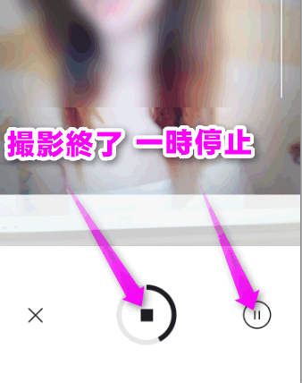 中央の四角いボタンをタップするか、バーが円の頂点に達すると撮影が終了します。