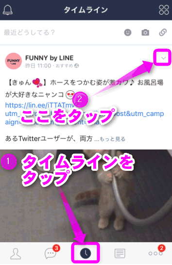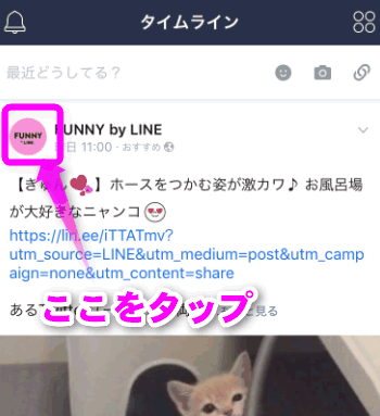 友だちでもない「FUNNY by LINE」などの投稿を消すには、右上の丸で囲った部分をタップします。