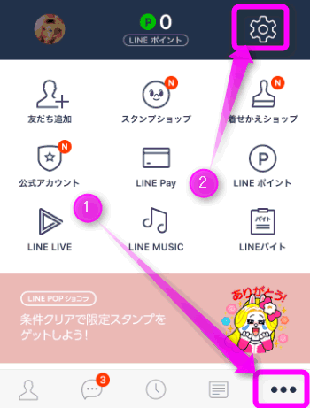 ①右下の「・・・」をタップし、②ダイヤルのアイコンをタップし、「設定」を表示させます。