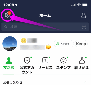 まずはiPhoneのLINEから。iPhoneのLINEはアンドロイドのLINEと違い、「設定」が「ホーム」の画面の―――