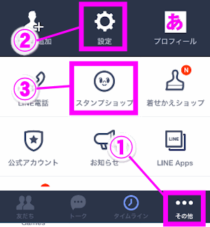 ①「その他」の②「設定」を開き、③「スタンプショップ」をタップします。