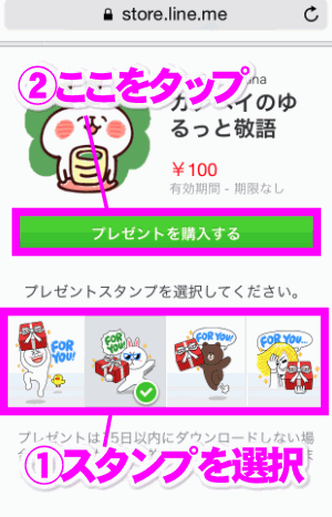 ①送るスタンプを選択し、②「プレゼントを購入する」をタップします。
