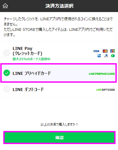 「LINEプリペイドカード」にチェックを入れ、「確認」をタップします。