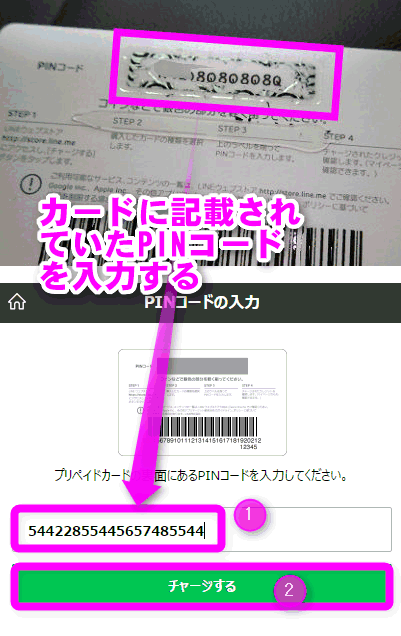LINEプリペイドカードの裏側に記載されていた「PINコード」を入力します。