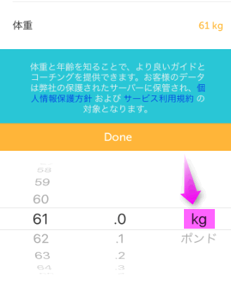 体重は単位が「ポンド」になっている場合があるので、「Kg」に修正しておいてください。