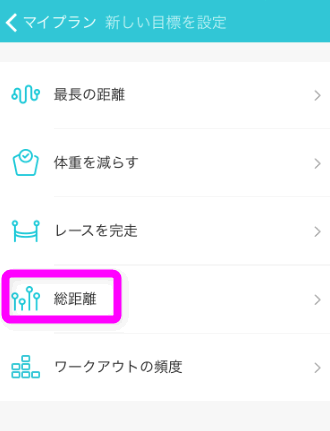 私はプレッシャーに弱いので、毎回〇㎞以上走る!というプランは苦手。なので、トータルで200㎞走破したときに知らせてくれる「総距離」を設定してみました。