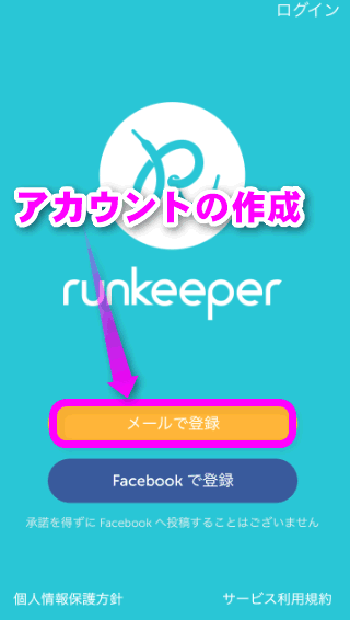 Runkeeperを使用するには、アカウントを作成しておく必要があります。Facebook を使っていれば、Facebook の認証ですぐに使用できます。が、今回はFacebookを使用しない方法でアカウントを作成してみます。アカウントを作成すると、データはネット上に保存され、iPhoneやスマホを買い替えても同じアカウントでログインすれば、過去のデータを引き継ぐことができます。また、同じアプリを使っている友達と競争することもできます。