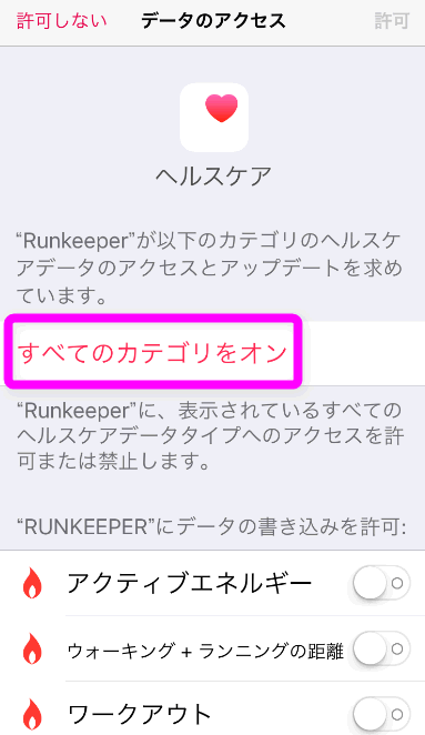 「すべてのカテゴリをオン」をタップして、右上の「許可」をタップします。これで「ヘルスケア」アプリに登録されました。