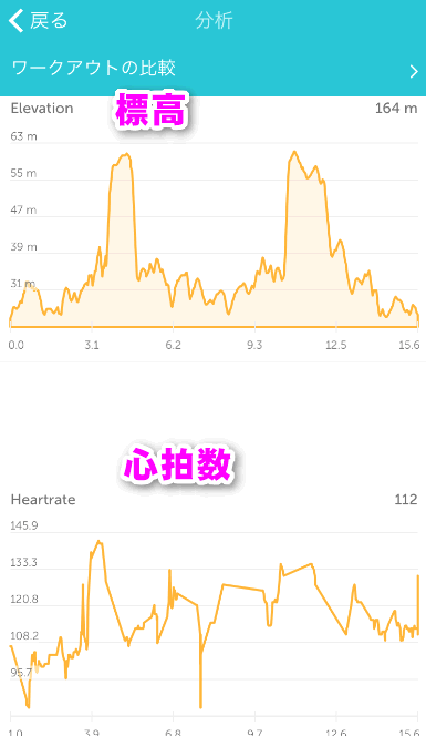 3.9キロ当たりで心拍数が激増しているのは、「Elevation」のほうでもわかると思いますが、一気に20mぐらいの坂をのぼったため。