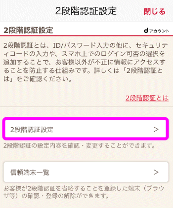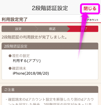 2段階認証をアプリに設定できました。右上の「閉じる」をタップします。