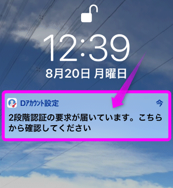 2段階認証をアプリに設定している場合、ドコモのサイトなどにログインしようとすると、iPhoneなどのスマホのロック画面に通知が表示されます。