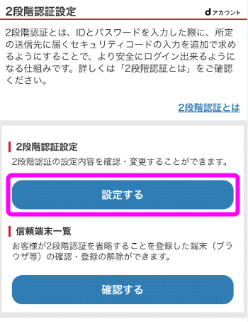 デフォルトではSMSにセキュリティコードが送られてきますが、「dアカウント設定」アプリで2段階認証を許可させることもできます。このアプリによる2段階認証を利用すると、いちいち6ケタのコードを入力しなくても、「はい」をタップするだけで認証ができます。