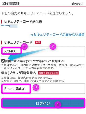 次回からセキュリティコードの入力を省く場合は、②の「信頼できる端末(ブラウザ等)として登録する」にチェックを入れておきます。