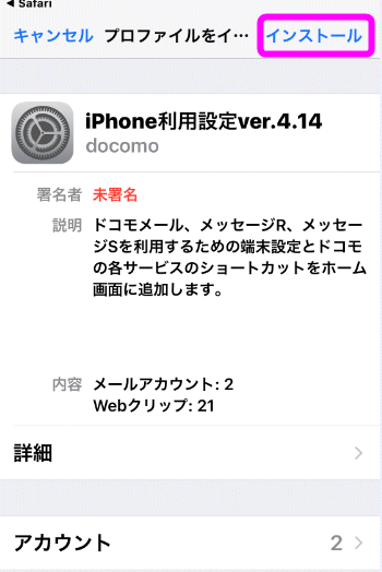 「このプロファイルは署名されていません」と表示されますが、右上の「インストール」をタップします。