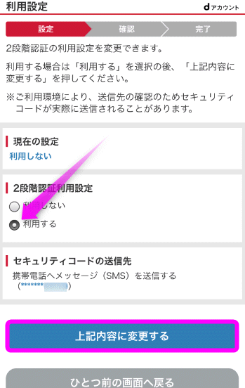 「2段階認証利用設定」の「利用する」にチェックを入れ、「上記内容に変更する」をタップします。