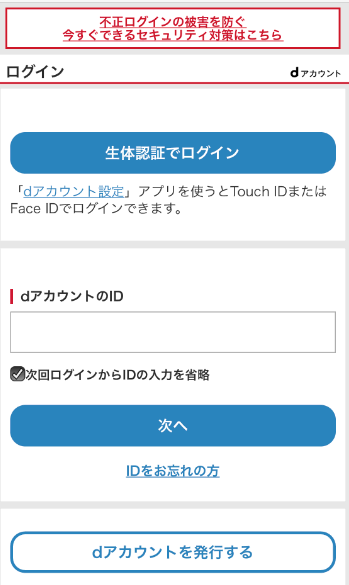 dアカウントのID(メールアドレス)とパスワードを入力します。