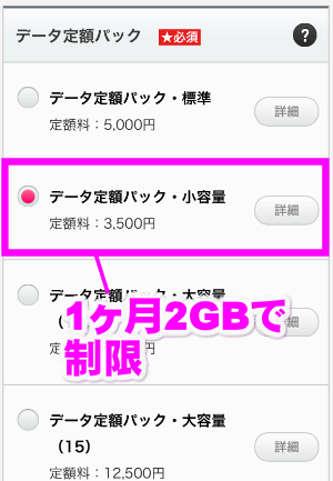 パケット定額プランを決めます。私はWi-Fiで使うことのほうが多く、電話の回数が非常に多いので、通話定額プランにし、パケットプランは「データ定額パック・小容量」を選択しました。