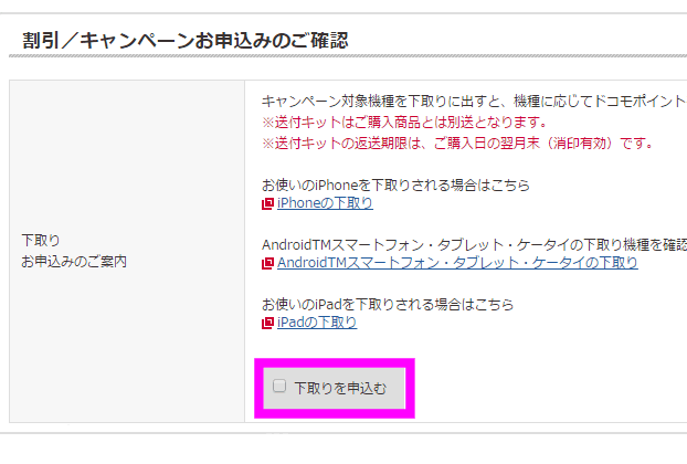 下取りを申し込む場合は、「下取りを申し込む」にチェックを入れます。