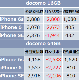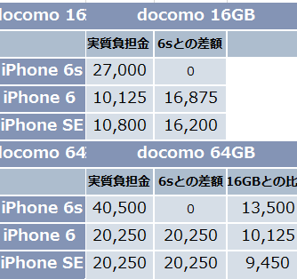 続いて、ドコモのiPhone 6s 、 iPhone 6 、 iPhone SE の2年間の支払額と、6sとの差額、16GB版との差額を比較。