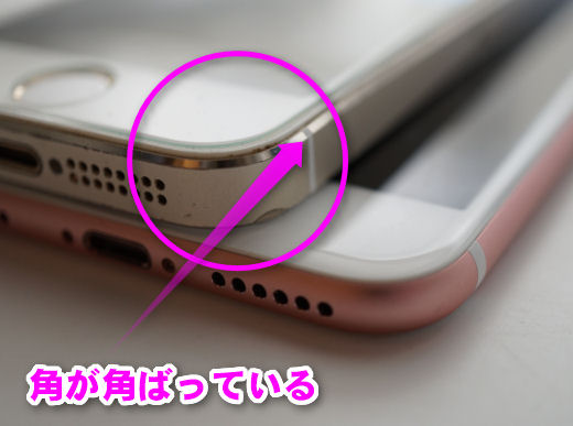 iPhone6から、角が丸まっているデザインに変更になりましたが、iPhone SEは、以前の角が角張ったデザインになります。