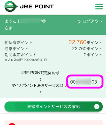 すると「JRE POINT交換番号(マイナポイント決済サービスID)」の横に数字が記載されています。この数字をコピーします。