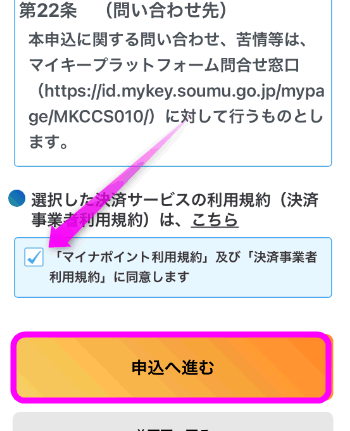 「マイナポイント利用規約」及び「決済事業者利用規約」に同意しますにチェックを入れ、「申込へ進む」をタップ。
